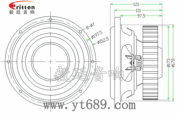 | 采用了泡边纸盆,50芯铜线音圈,频响范围为44Hz~1.5KHz,低频极震撼,音质细腻;