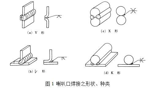 喇叭口焊接(Flare Welding)是使用于圆条与圆条,圆条与板,或轻量型钢之接合。喇叭口焊接之形状种类示于图1。在喇叭口焊接,因根部之熔透困难,且发生缺陷之情形较多,需要注意。