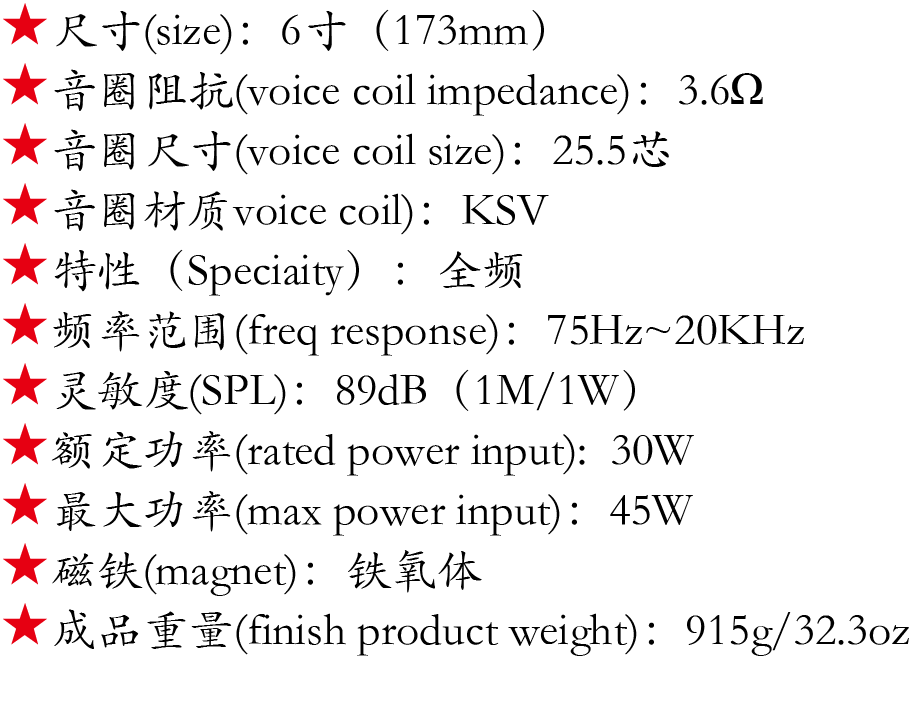 功率:最大45w 功率输出,防紫外线稳定,4 Ω 阻抗 75 - 20,000 赫兹,频率 89dB (1W/m) 灵敏度 。