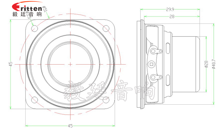 45mm方形铁盆架内磁全频喇叭,采用稀土高强磁磁钢,密度高,磁性强,使音色清晰、饱满;